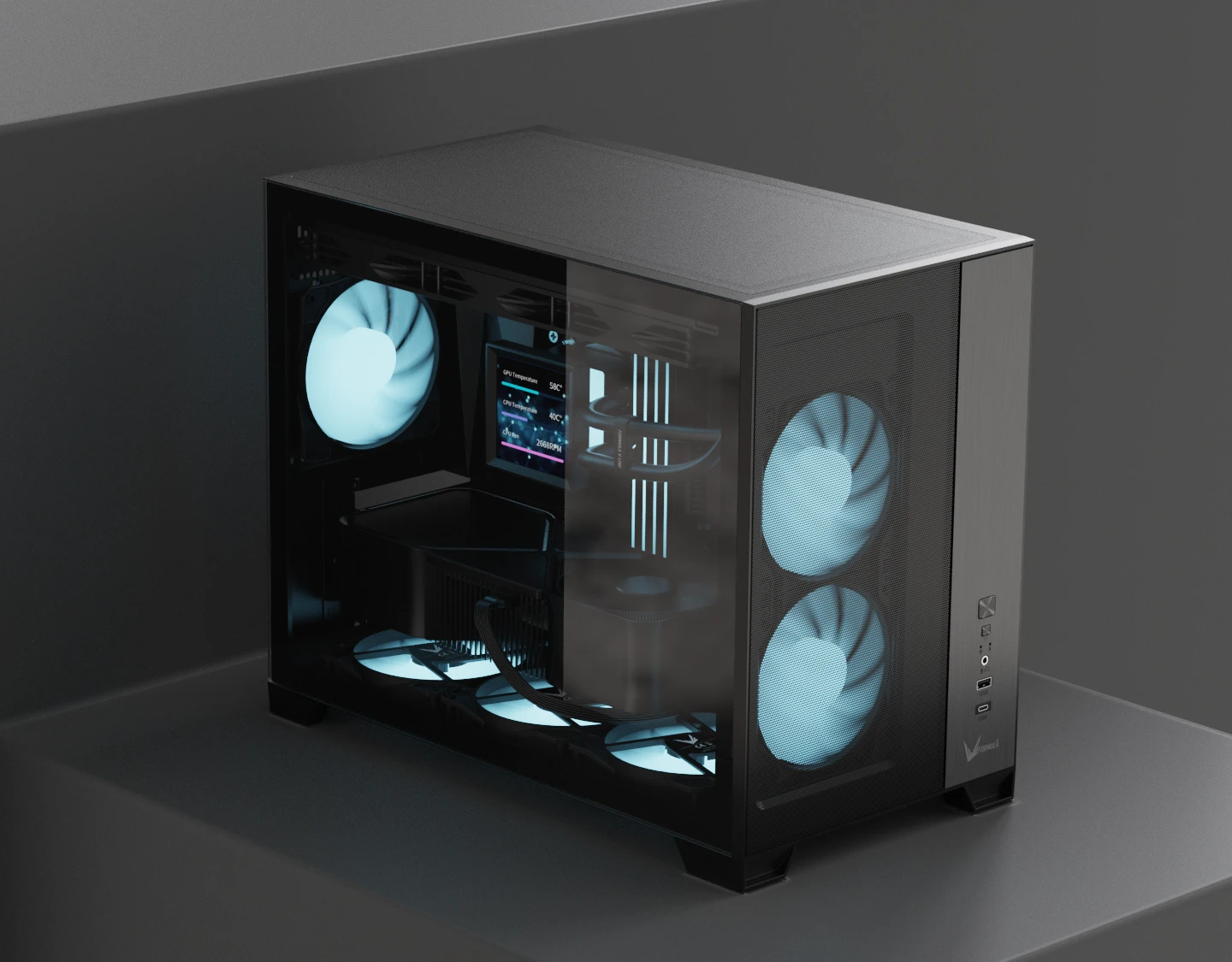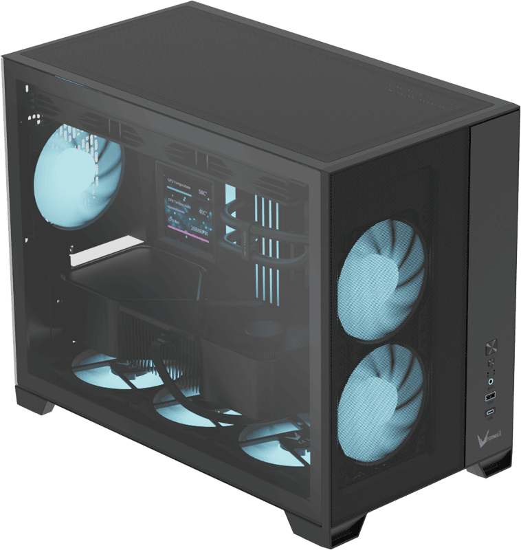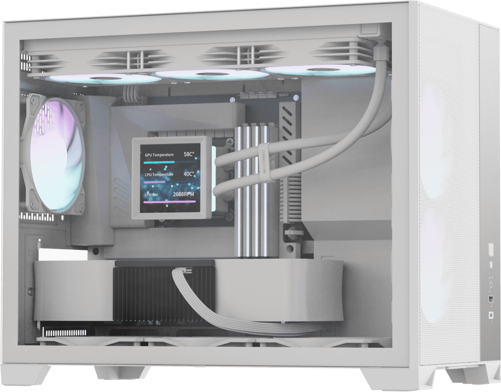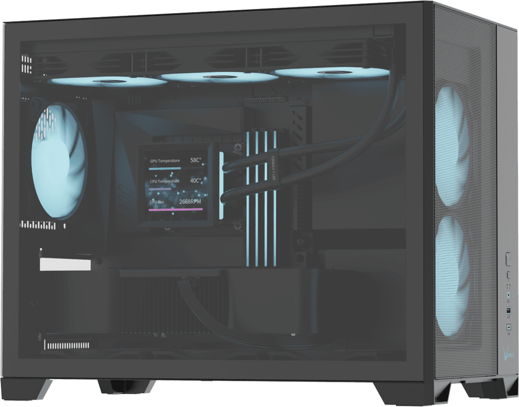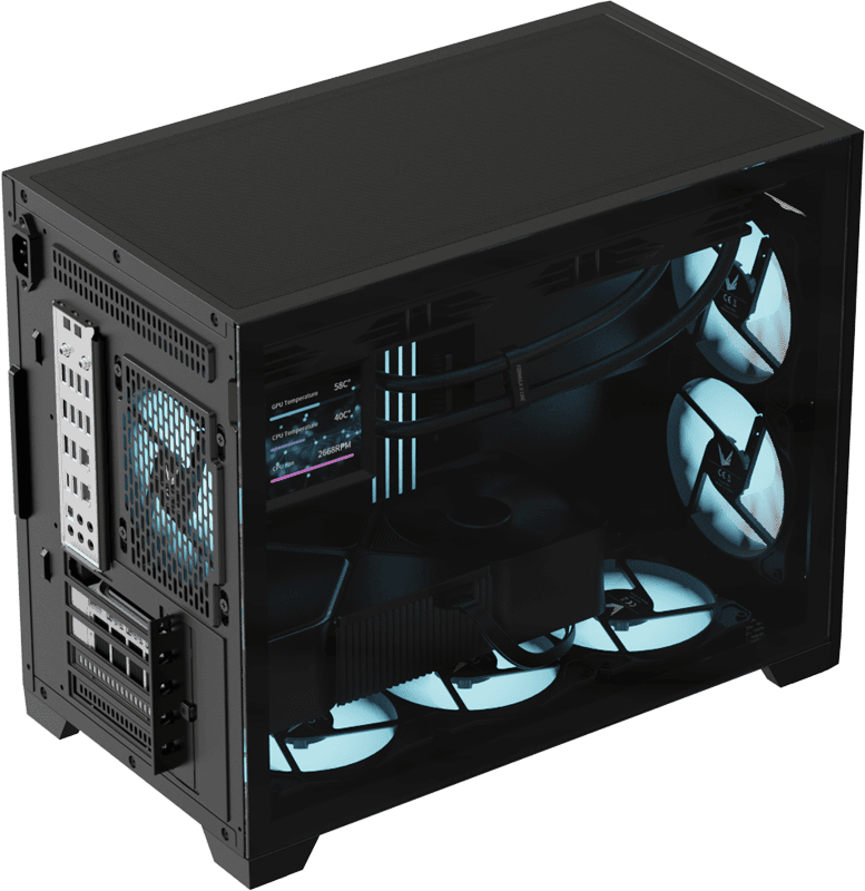 The front-mounted power supply layout reduces overall width while keeping interior airflow unobstructed. This design maintains strong thermal performance without adding bulk to your setup.