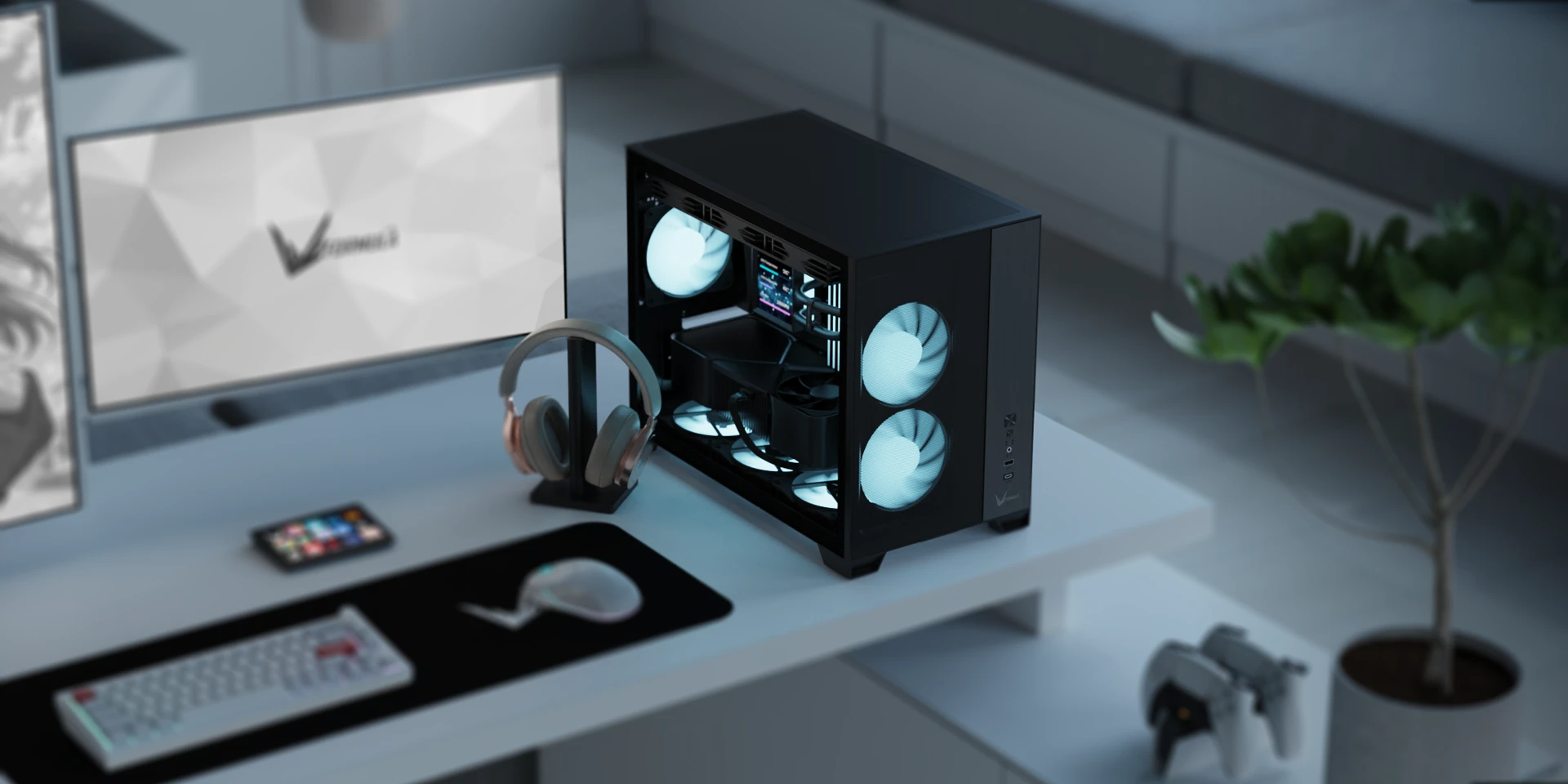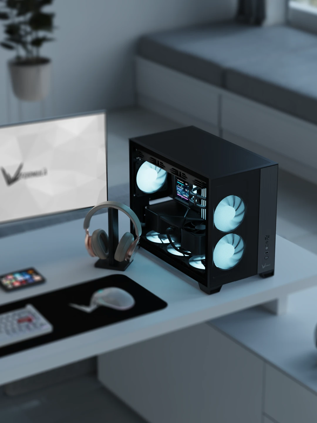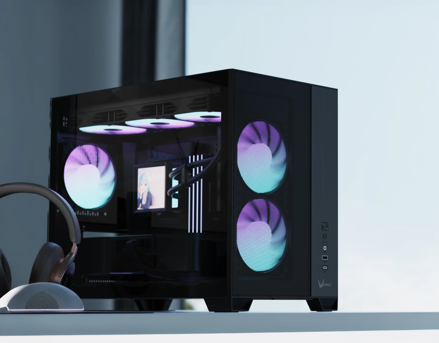 The front-mounted power supply layout reduces overall width while keeping interior airflow unobstructed. This design maintains strong thermal performance without adding bulk to your setup.