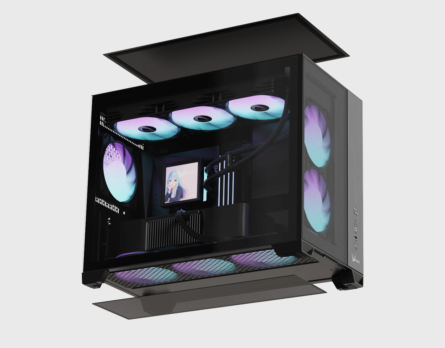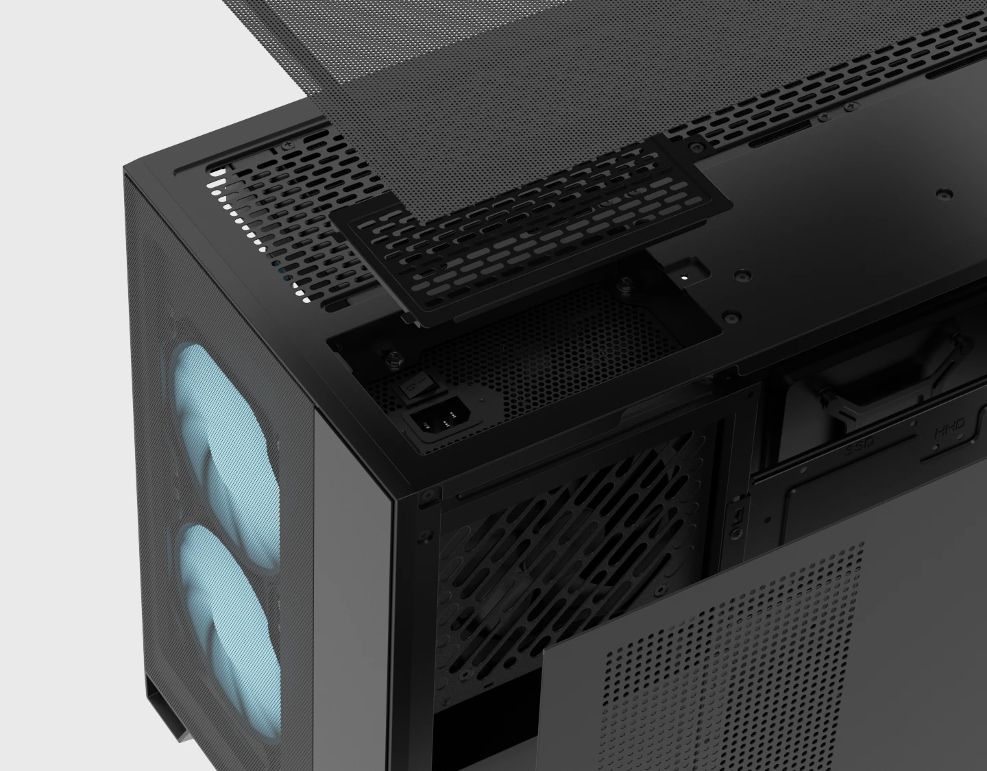 The top panel supports up to a 360mm radiator, offering flexible and powerful liquid-cooling compatibility.