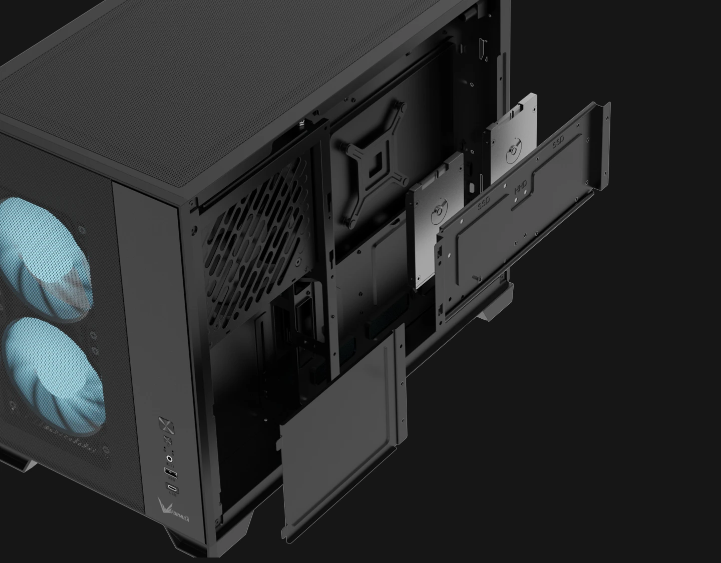 The removable bracket supports either two SSDs or one 3.5″ HDD, while the PSU shroud cover helps keep the build layout clean and organized.