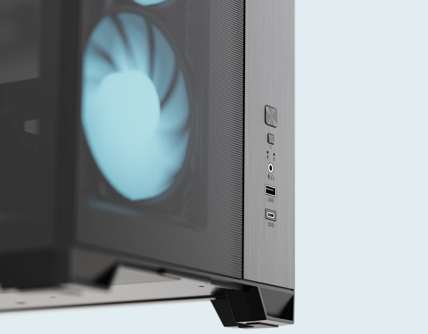 A wide-open mesh front panel maximizes intake ventilation, enhanced with a brushed-metal decorative plate for a clean and refined look.