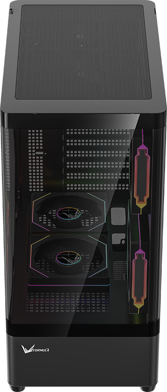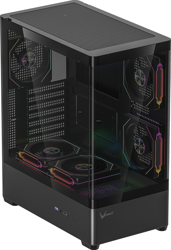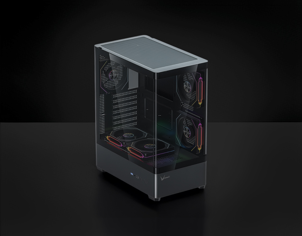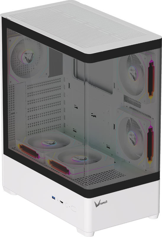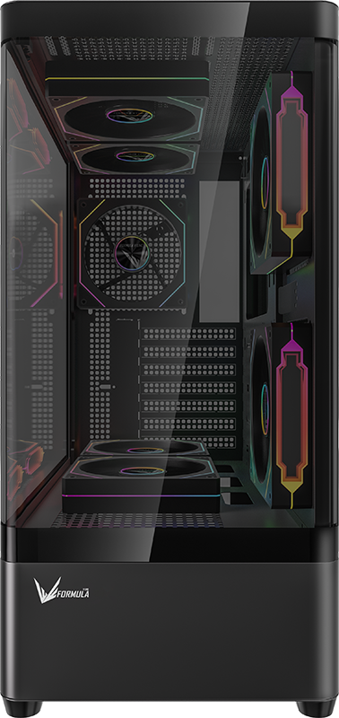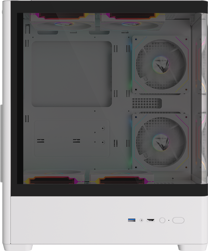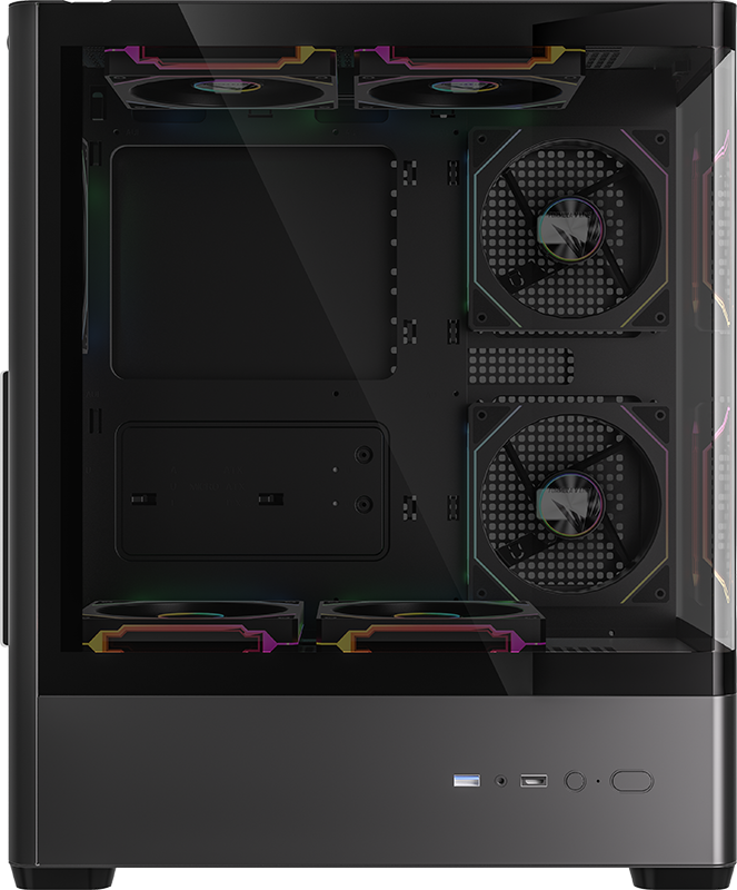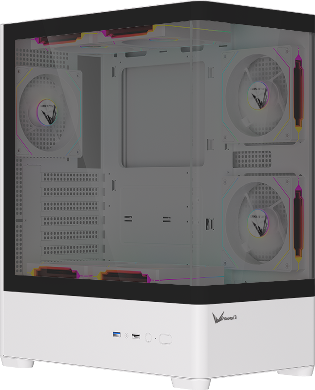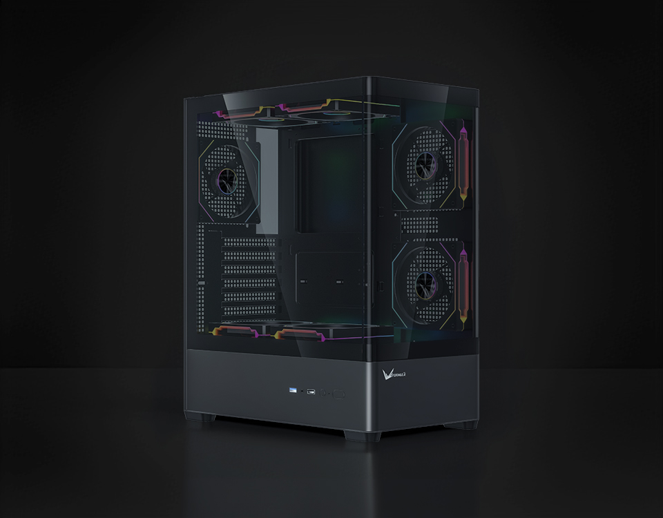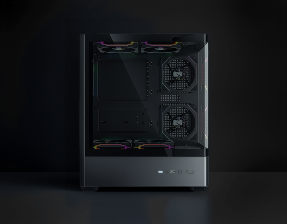 Stylish curved acrylic front and panoramic tempered glass side panel showcase internal components with elegance.