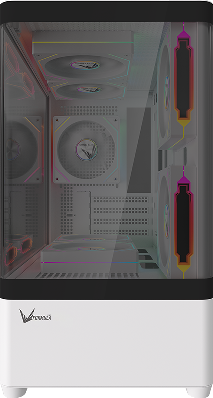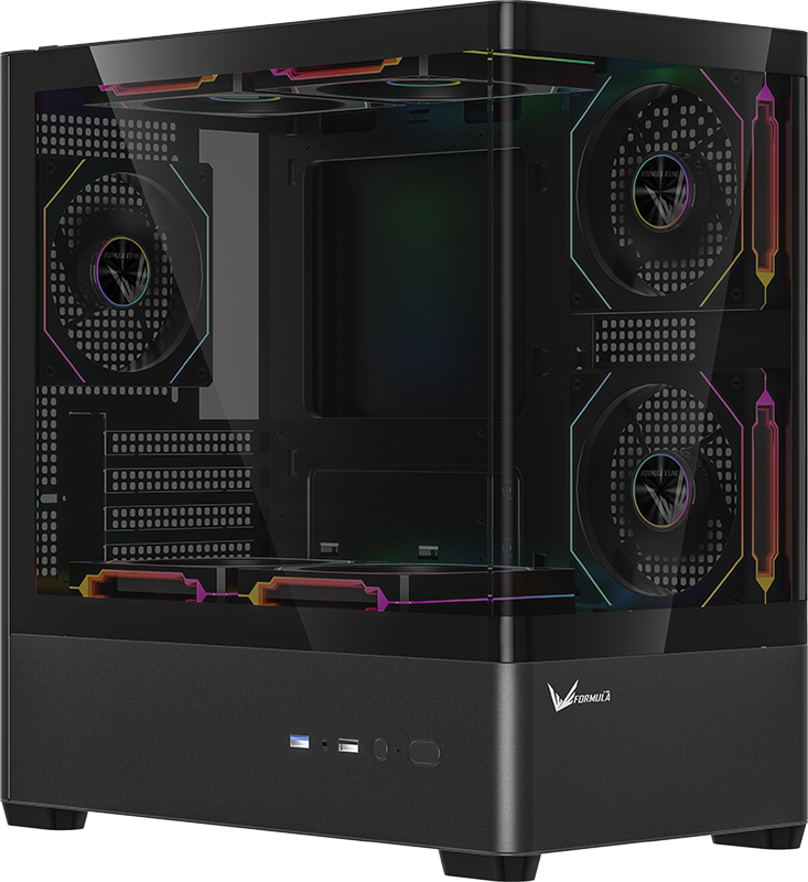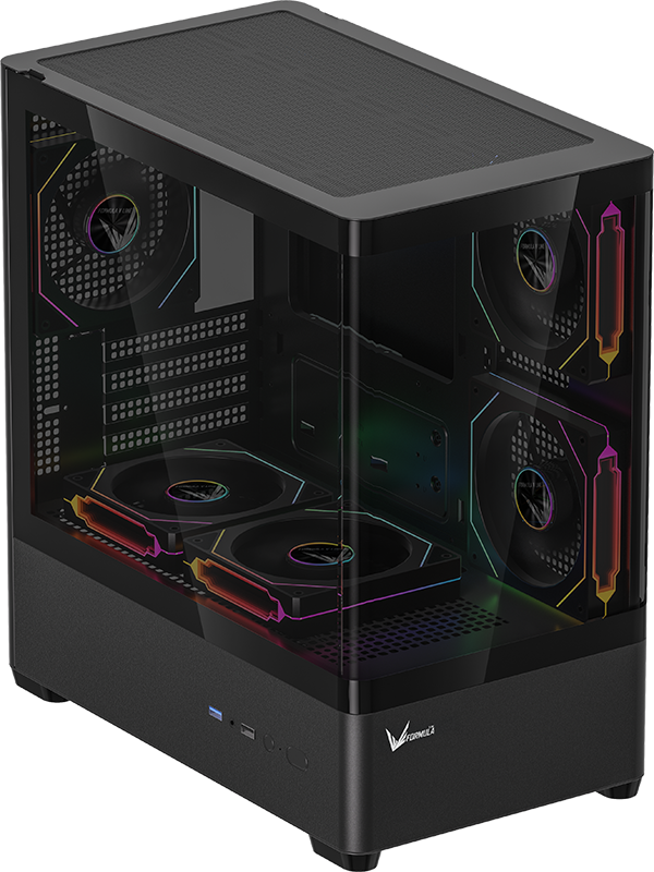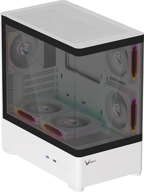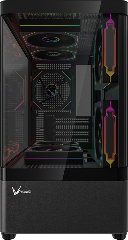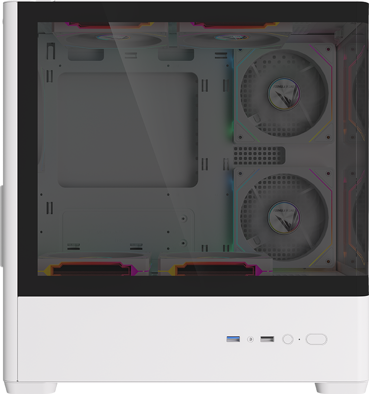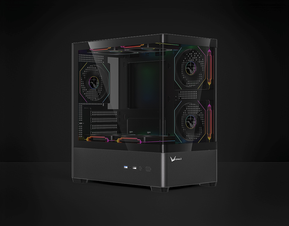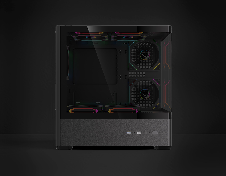 Stylish curved acrylic front and panoramic tempered glass side panel showcase internal components with elegance.