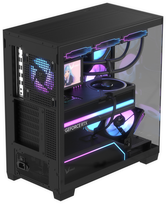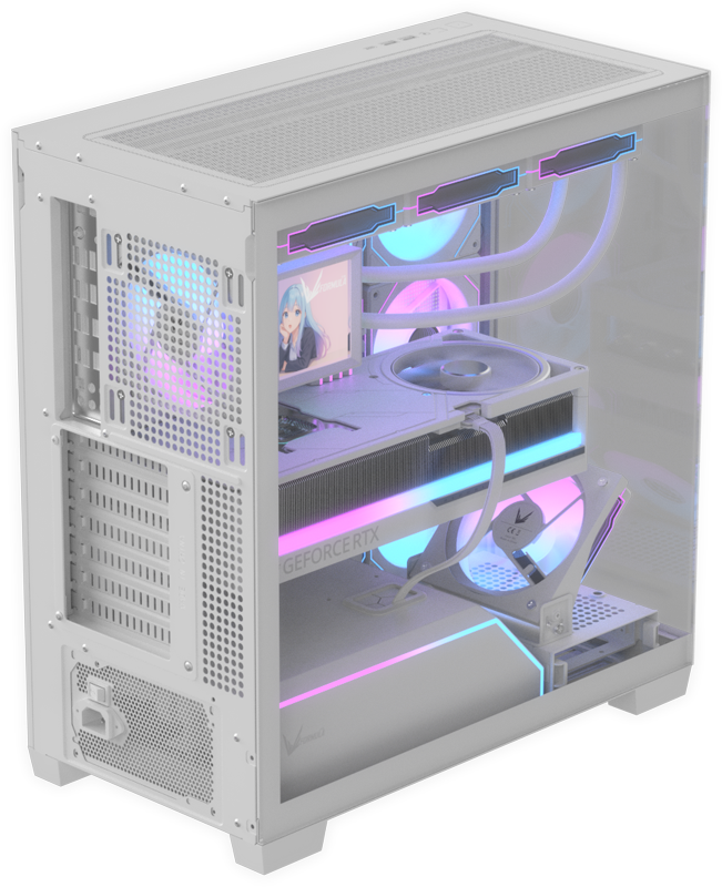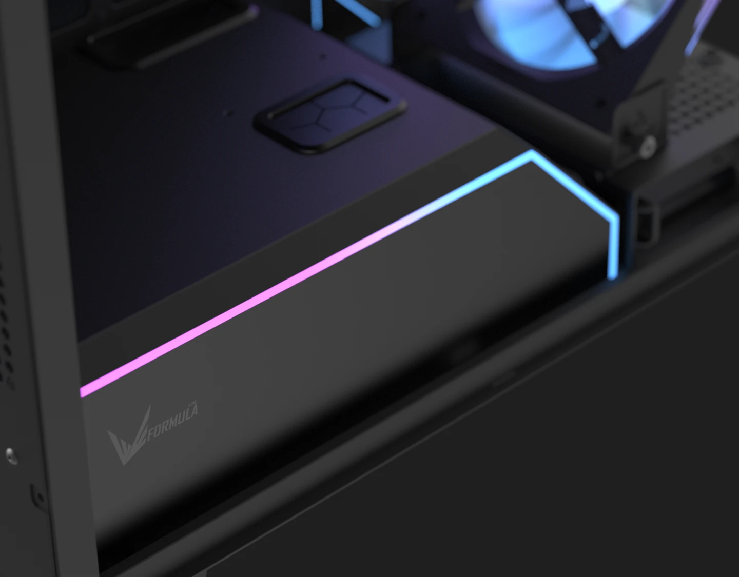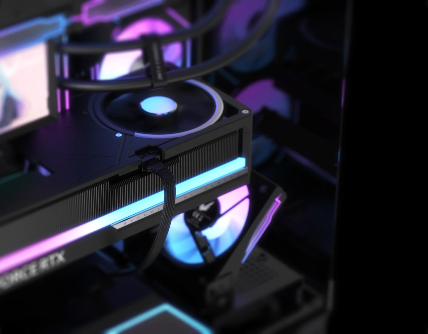 A built-in ARGB light strip on the power shroud extends illumination from the bottom up, enhancing visual depth and creating a more immersive lighting experience.
