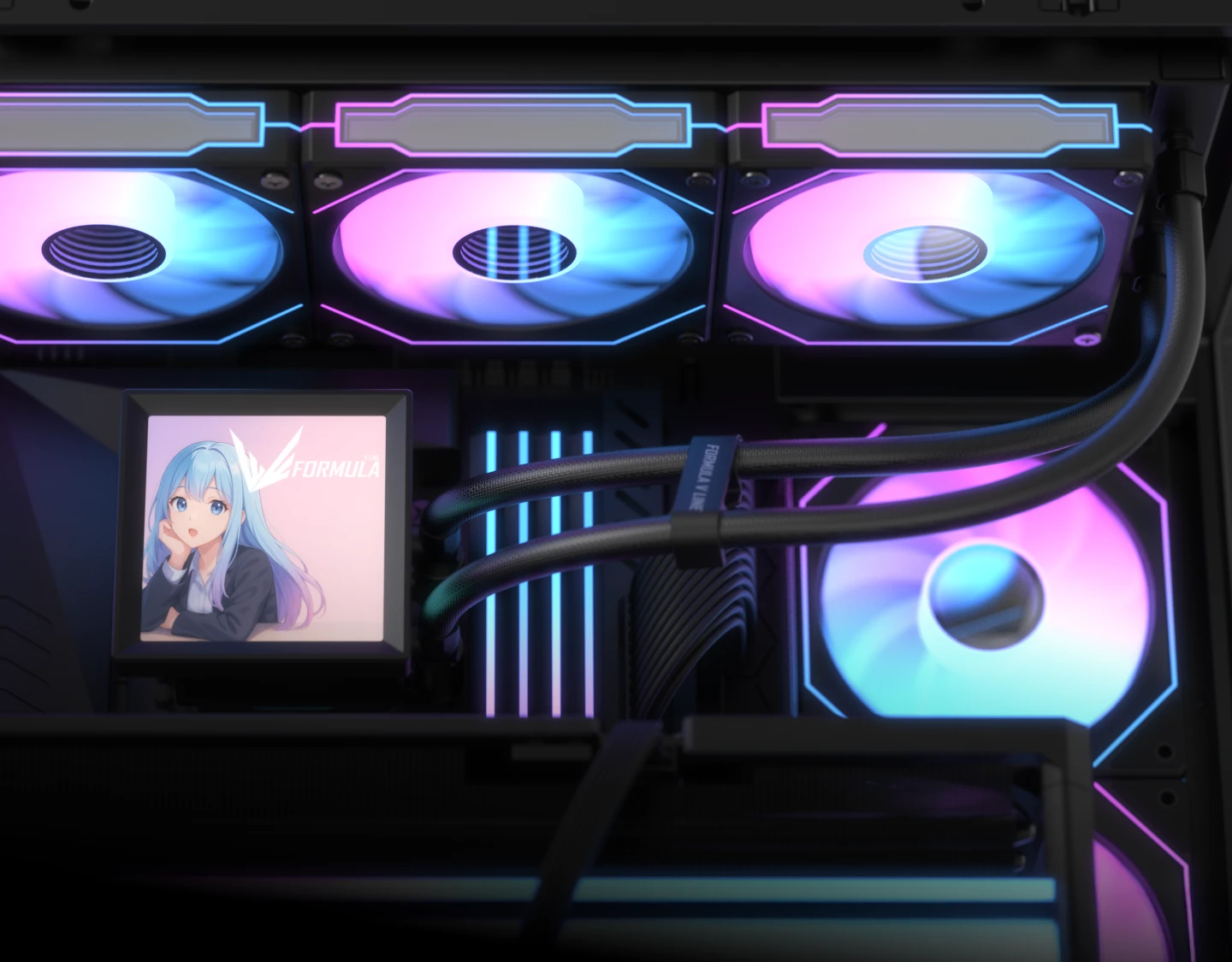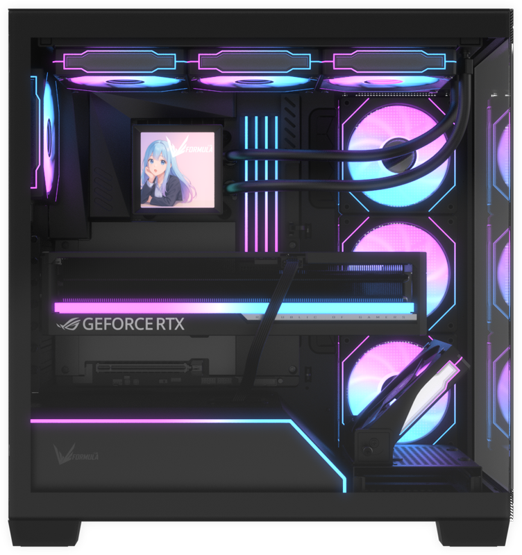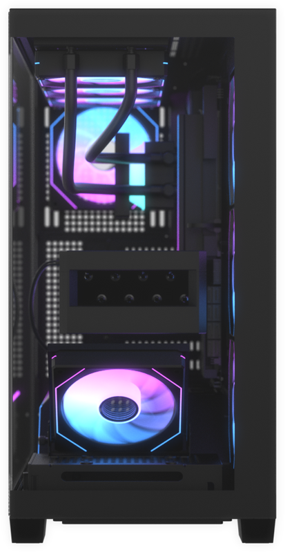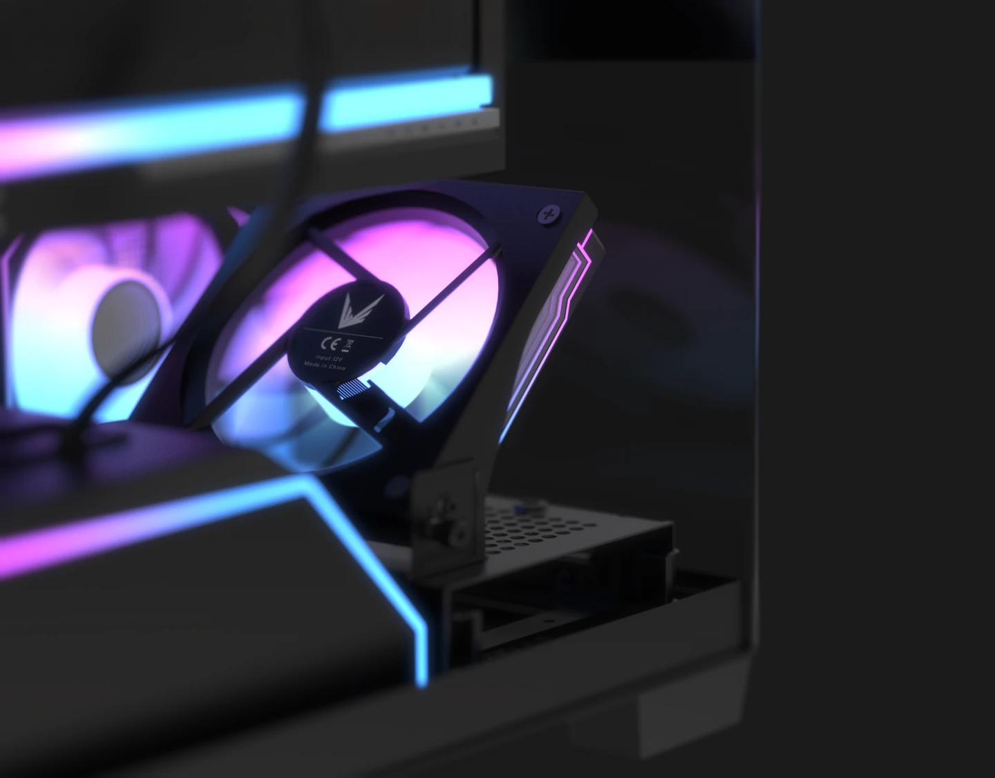 A built-in ARGB light strip on the power shroud extends illumination from the bottom up, enhancing visual depth and creating a more immersive lighting experience.