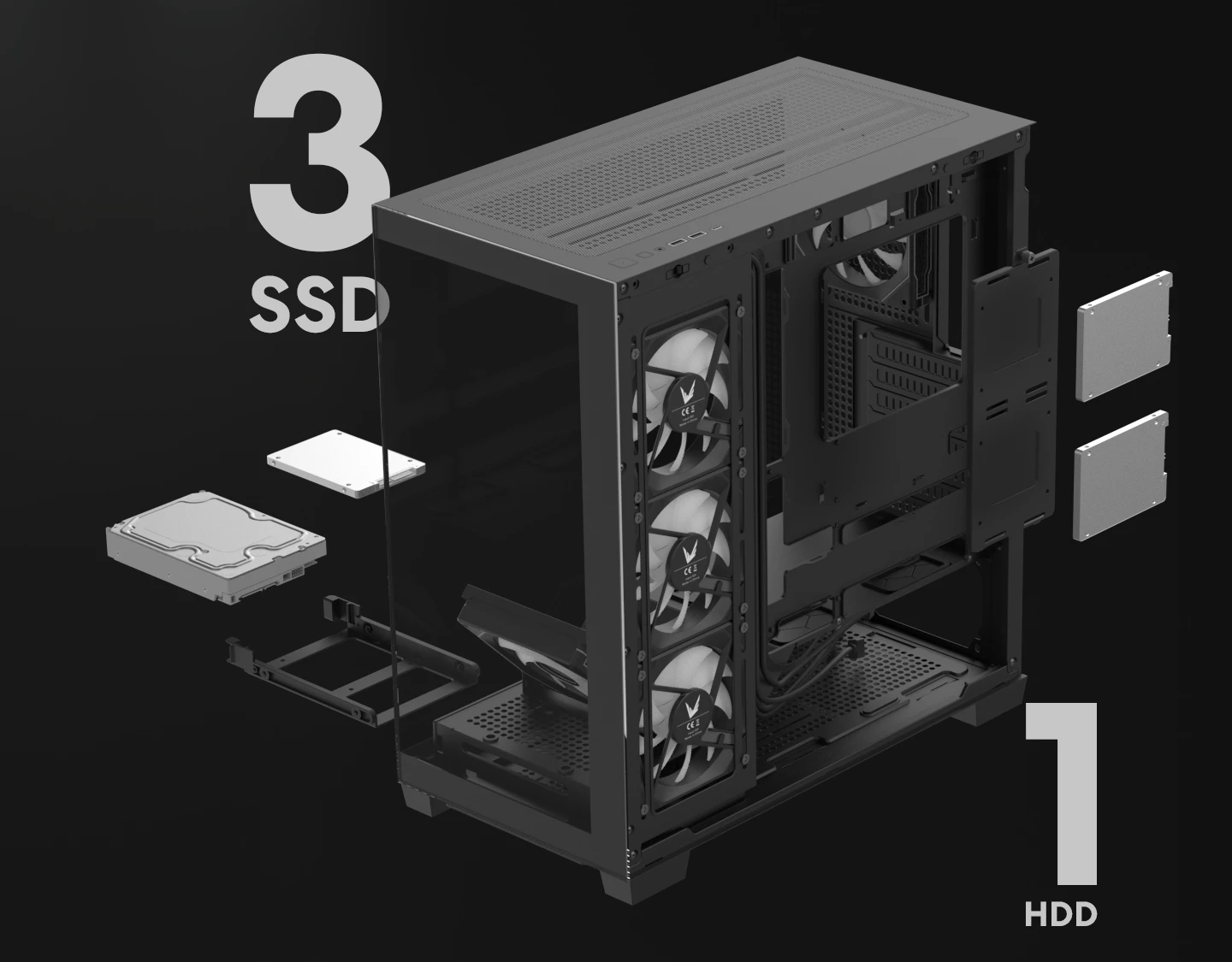 Supports 1 x 3.5″ HDD and 3 x 2.5″ SSDs, offering the perfect balance of storage capacity and speed for both your system and files.