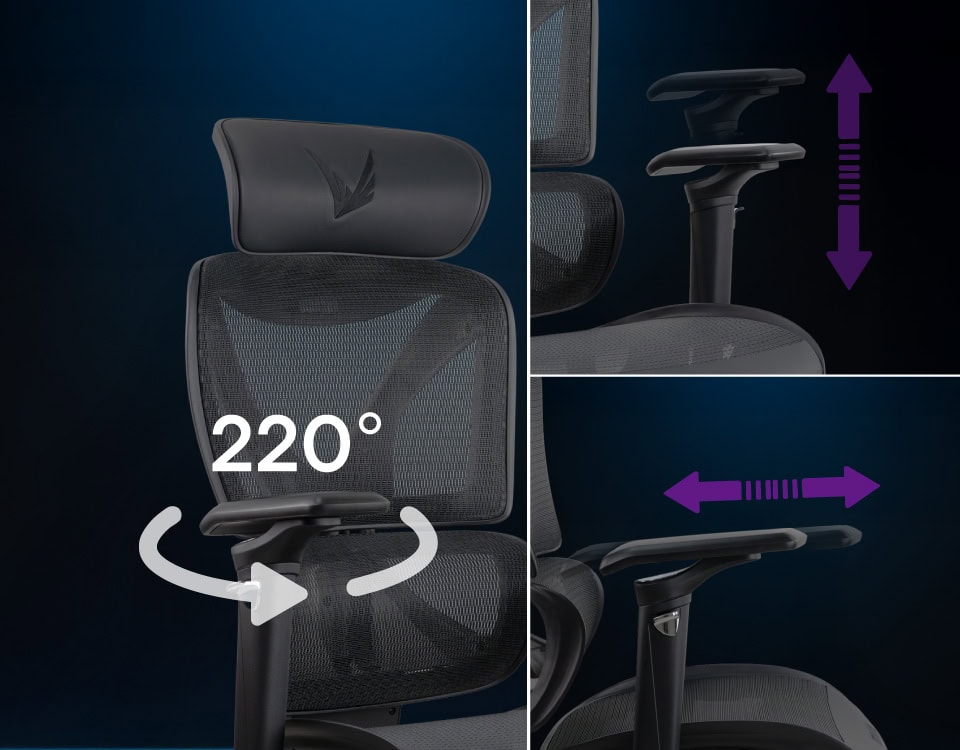 Fully adjustable in height, width, depth, and angle with wide 220° rotation. Fits various working postures and reduces shoulder strain.