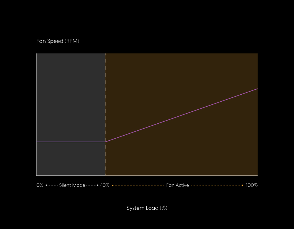Intelligent semi-passive design keeps the cooling fan completely off under 40% system load. Ensuring silent operation during everyday use while preserving long-term reliability.