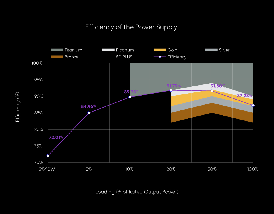 Achieves over 87% efficiency at 115V and up to 90% at 230V, minimizing wasted heat, cutting electricity costs, and enhancing long-term PSU reliability.