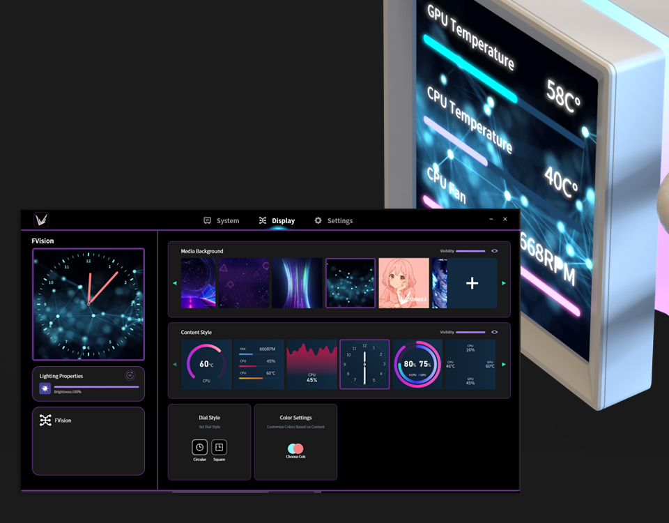Ice Jet Vision 360 elevates liquid cooling with a 3.95-inch customizable LCD display, powerful cooling performance, and an innovative unified 360 mm fan module. Its detachable magnetic screen, intuitive software interface, and vivid ARGB lighting combine aesthetics and functionality to deliver a cooling solution that stands out visually and performs with precision.
