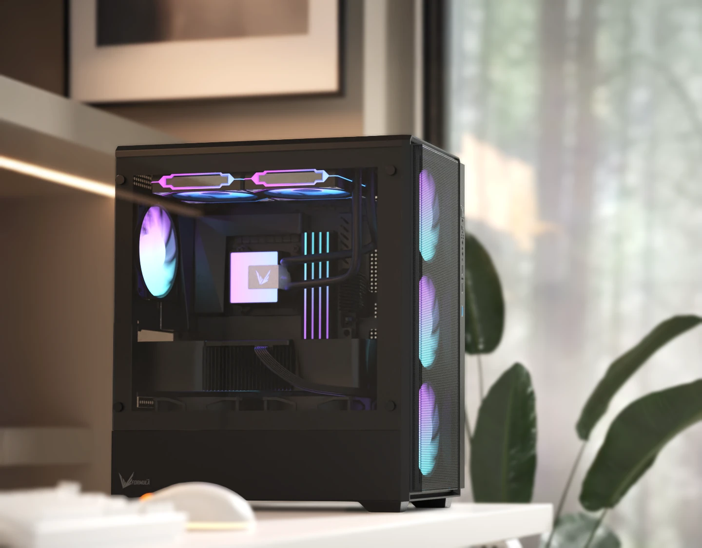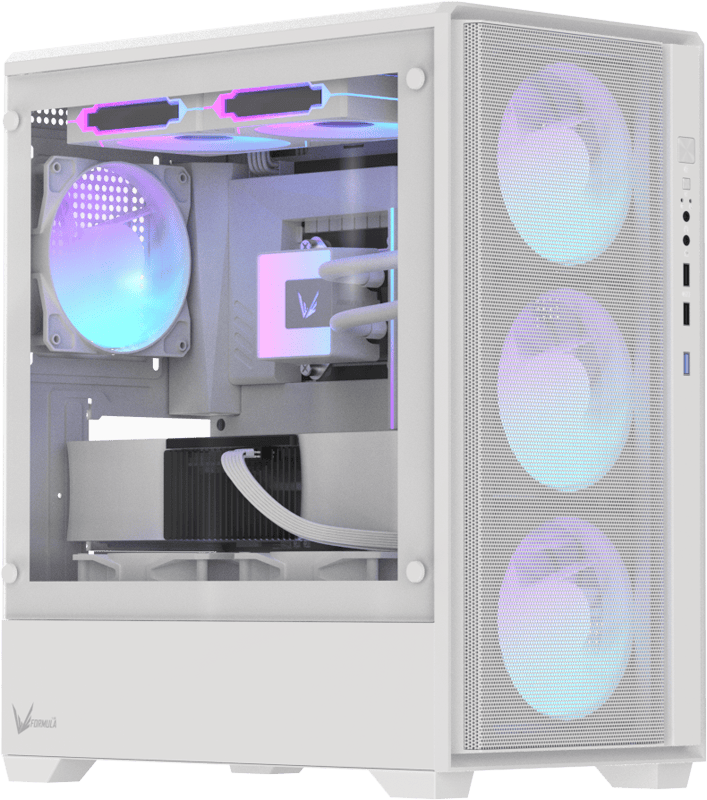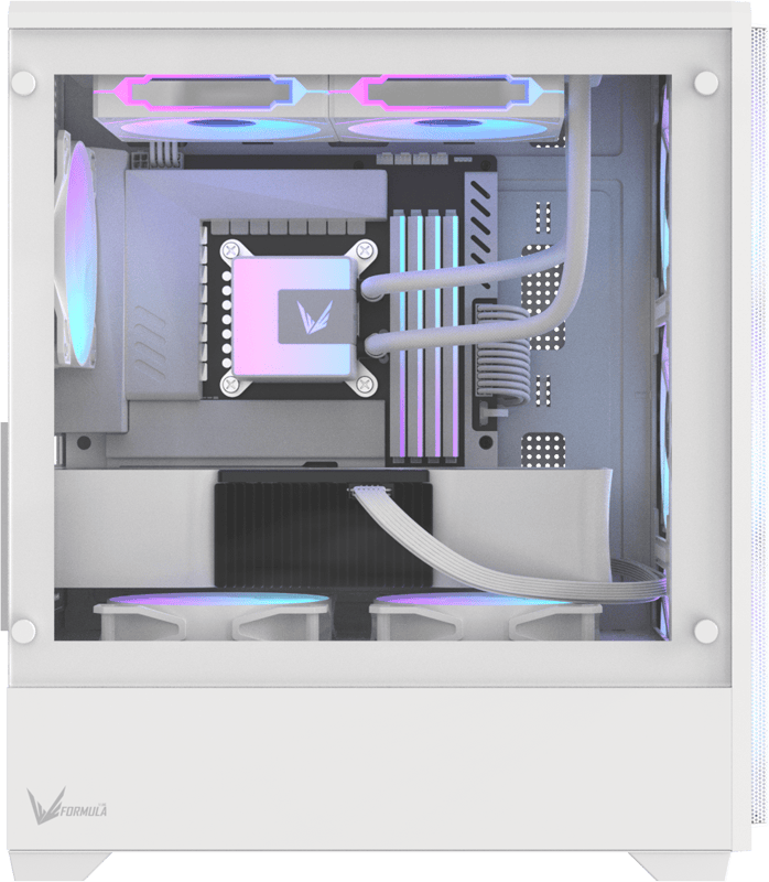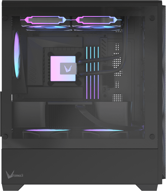 Боковая панель из закалённого стекла обеспечивает полный и открытый обзор комплектующих, подчёркивая подсветку, систему охлаждения и аккуратную прокладку кабелей.