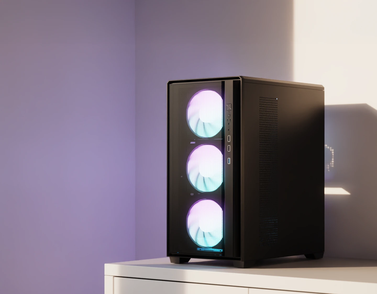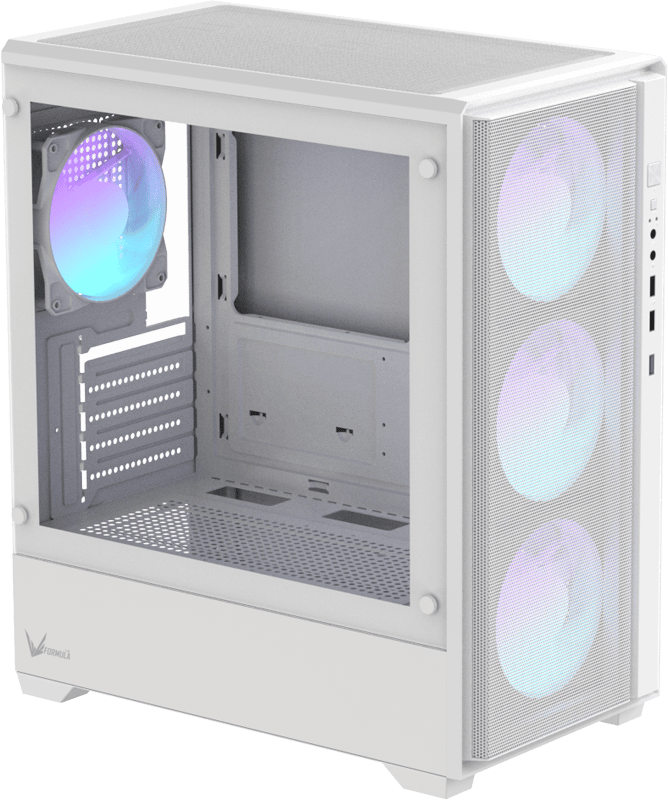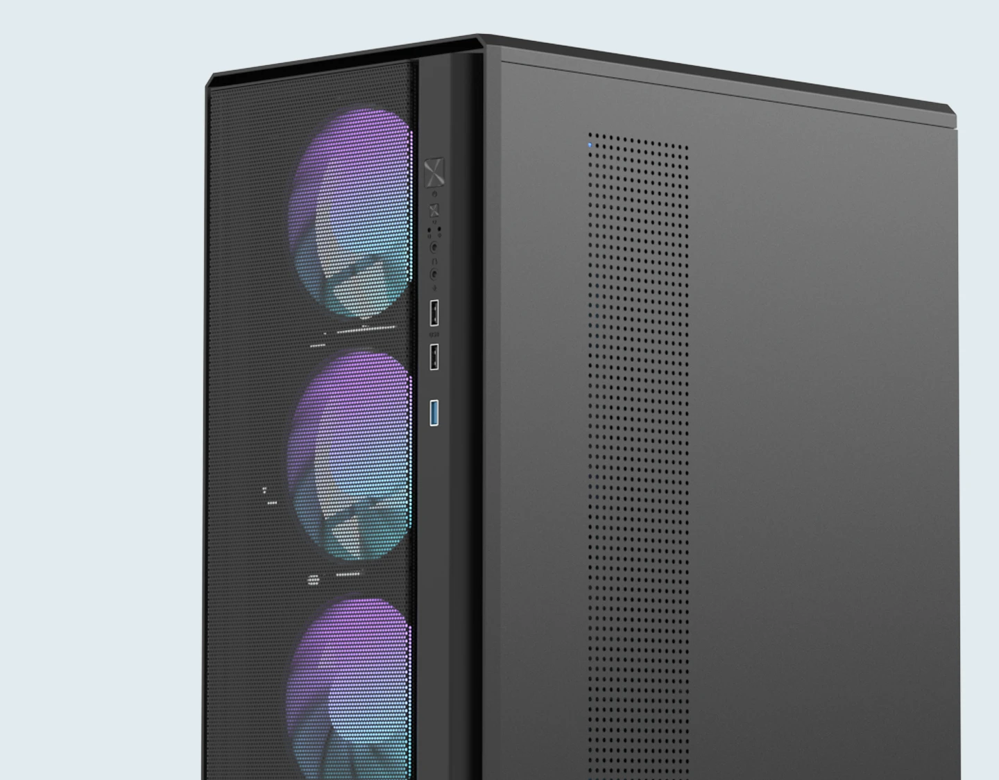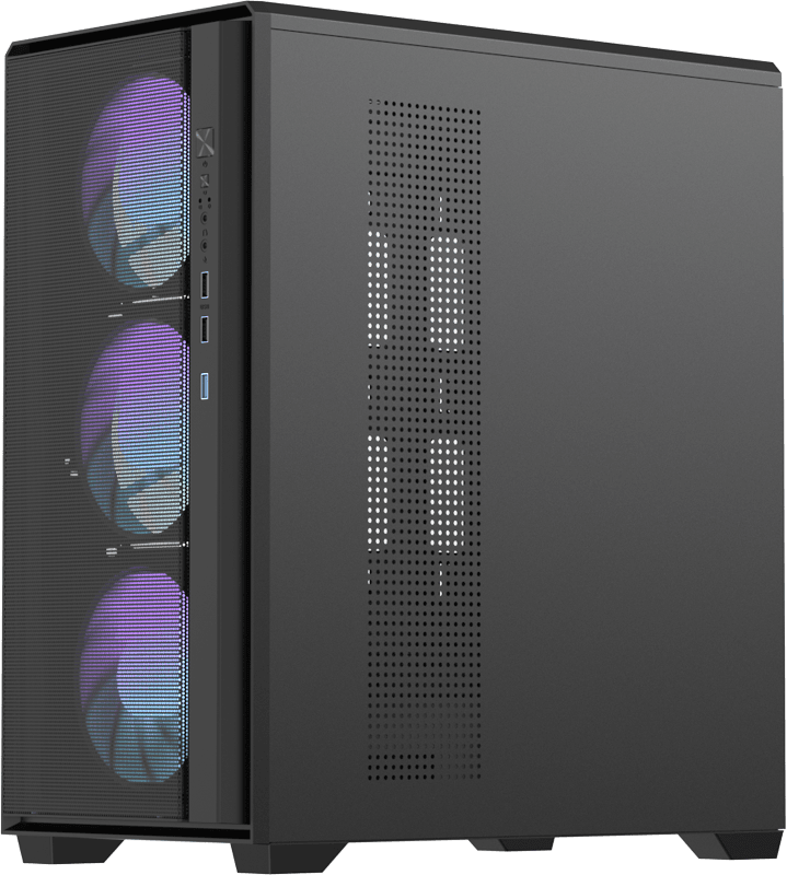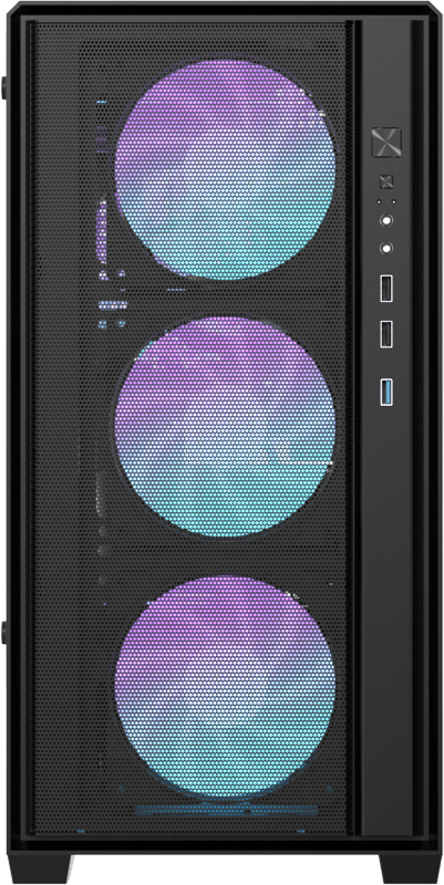 Сетчатая фронтальная панель обеспечивает прямой и эффективный приток воздуха к основным компонентам, сохраняя современный и аккуратный внешний вид.