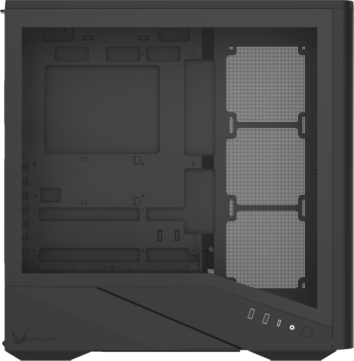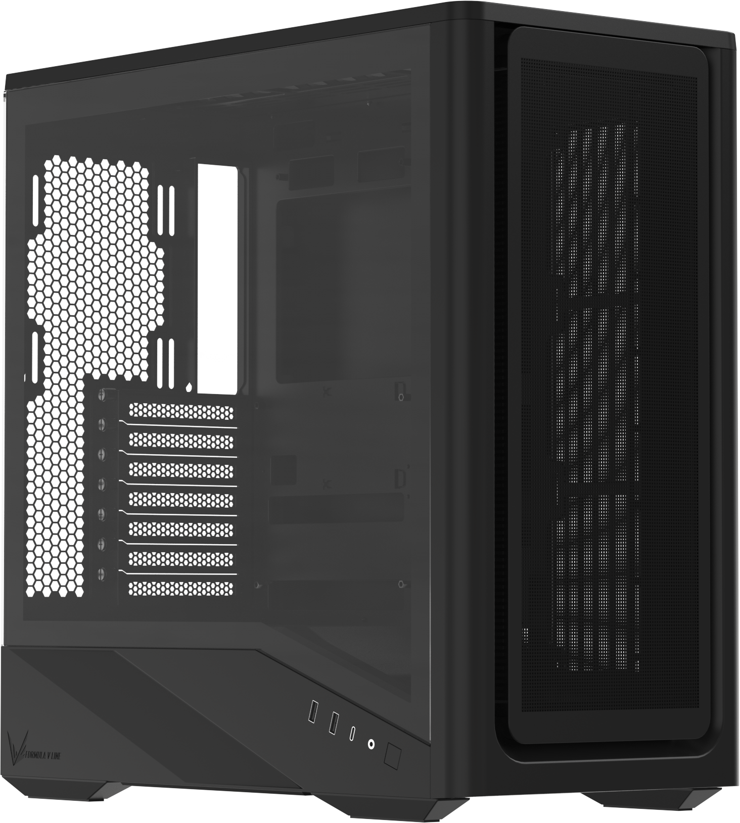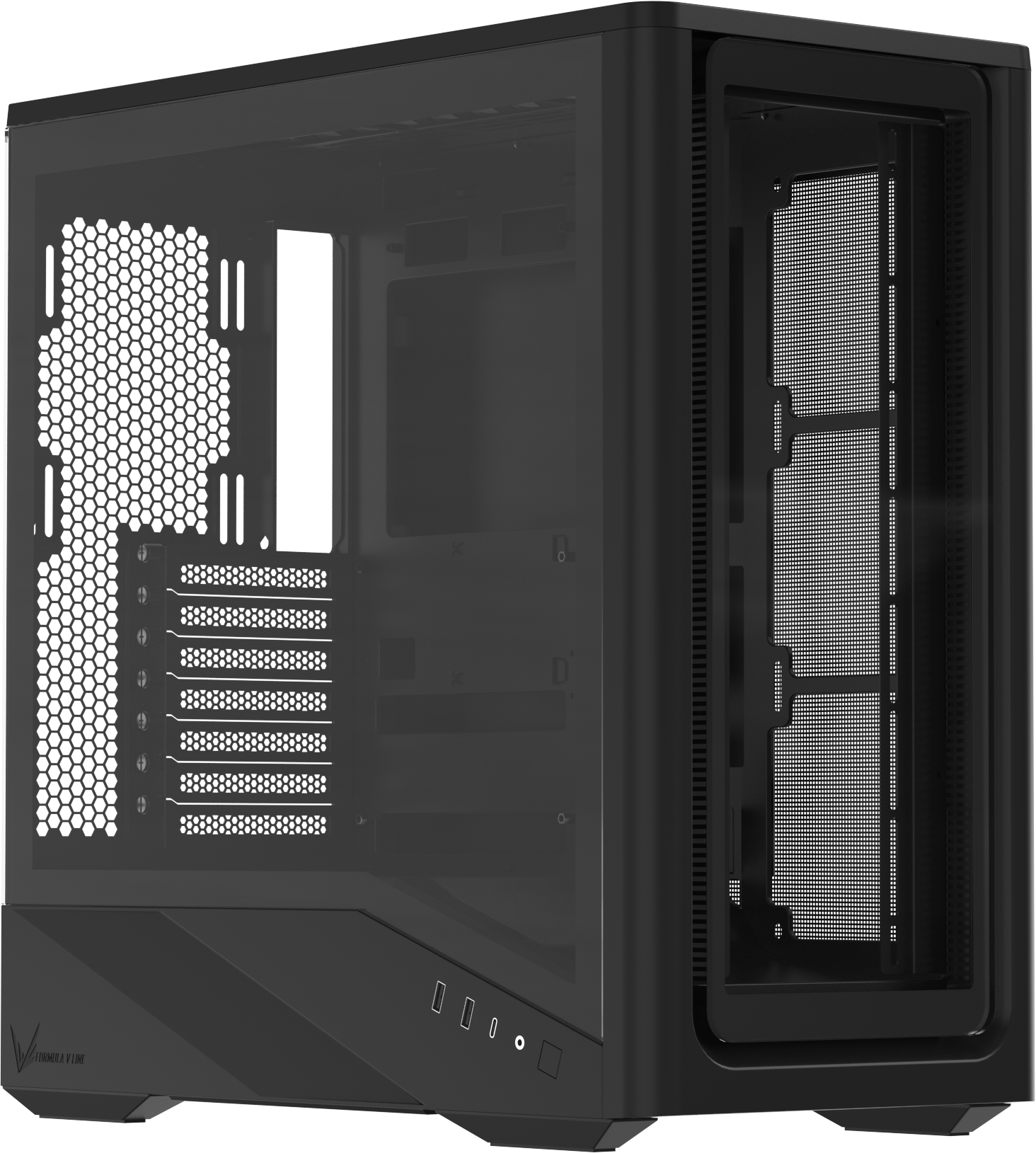 Боковая панель оснащена большой вентиляционной зоной, обеспечивающей дополнительный приток или вытяжку воздуха для боковых вентиляторов и позволяющей нижним вентиляторам забирать больше прохладного воздуха. Такое решение улучшает воздушный поток и общую эффективность охлаждения.