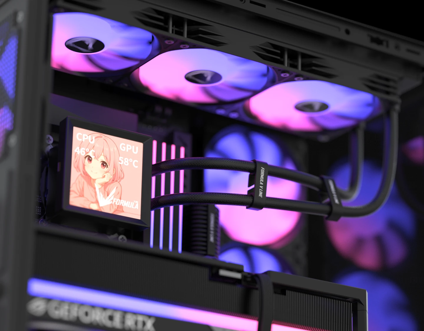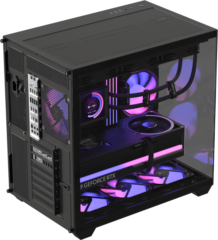 Корпус допускает установку радиатора 360 мм как на верхней панели, так и на боковой стойке возле материнской платы, позволяя выбирать оптимальную конфигурацию охлаждения с учётом пространства, направления потока или визуальных предпочтений.