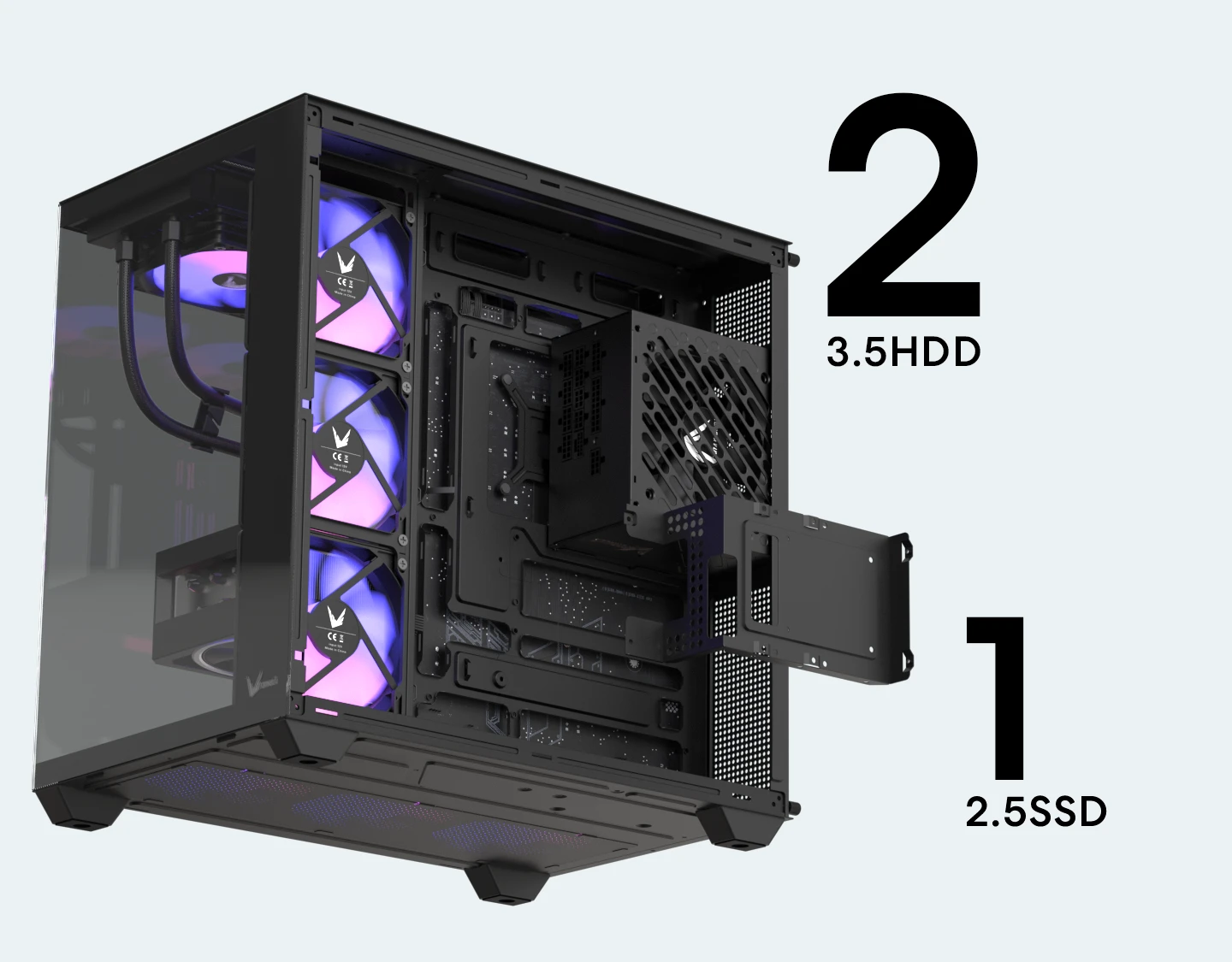 Расширенная зона за поддоном материнской платы позволяет эффективно организовать проводку, а также поддерживает установку накопителей форматов 3.5″ и 2.5″.
